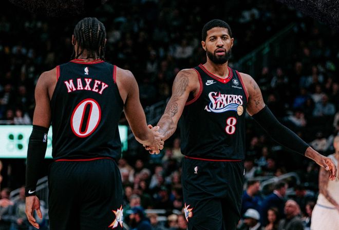此外,本赛季三分球命中数,马克西61记联盟第一;本赛季马克西场均出战40.6分钟,联盟断档式第一;场均33.4分4.7篮板7.9助攻1.6抢断,场均得分仅次于东契奇,联盟第二;马克西只用15场比赛,就达成赛季500分100助攻,历史上最快控卫!而过去三个赛季,马克西已经4次单场砍下至少50+,全联盟仅次于亚历山大的5次。本赛季全联盟只有两人得分突破500,亚历山大和马克西!很强,关键马克西还耐造。首先,去年夏天,76人干了两件傻事:给了恩比德3年1.93亿提前续约合同;4年2.12亿超级顶薪签下保罗乔治。