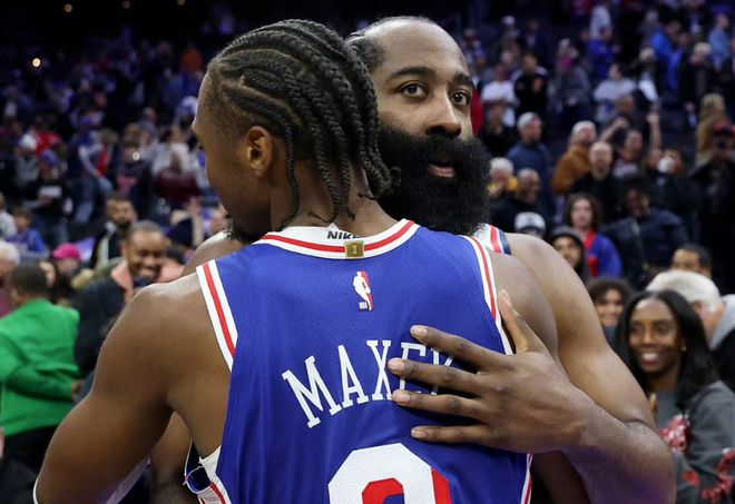 哈登离开后,马克西最近三个赛季场均助攻提升到6.5次。反而是恩比德在场时,破坏球队化学反应。记得哈登曾在一次采访时说过,他告诫马克西,把2亿合同存到银行,忘掉这一切,然后努力训练,这会让他取得更大成就。马克西有没有存银行不得而知,但用他自己话说,他从哈登那里学到很多,不仅仅是篮球,每次见到他,都希望全力以赴和他竞争,这就是对哈登最大的尊重。当然,哈登还会在比赛结束后,主动和马克西母亲拥抱致意。从队友到导师,马克西的成长轨迹,离不开哈登。
